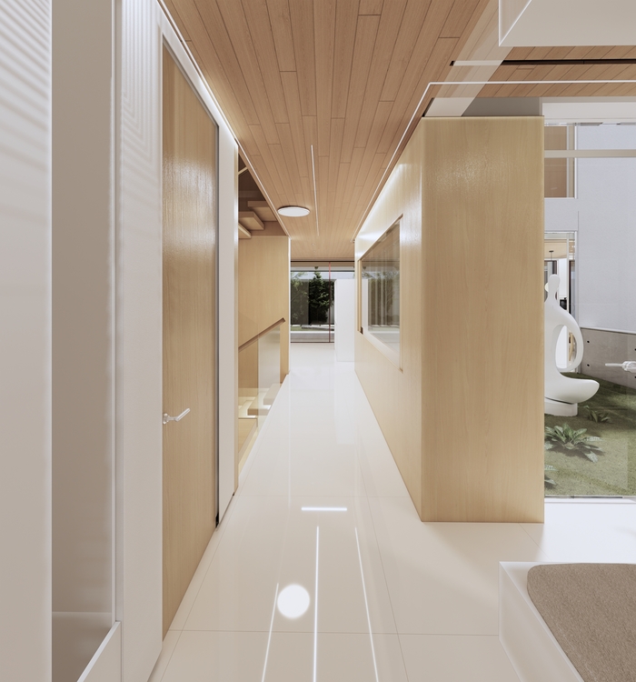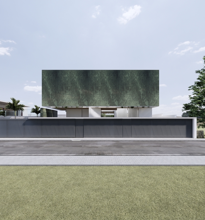 Implantada num terreno com declive acentuado, a Casa Sodimo é desenvolvida em três níveis, com uma cave que abriga áreas técnicas e garagem, um piso térreo social e uma zona íntima no andar superior.