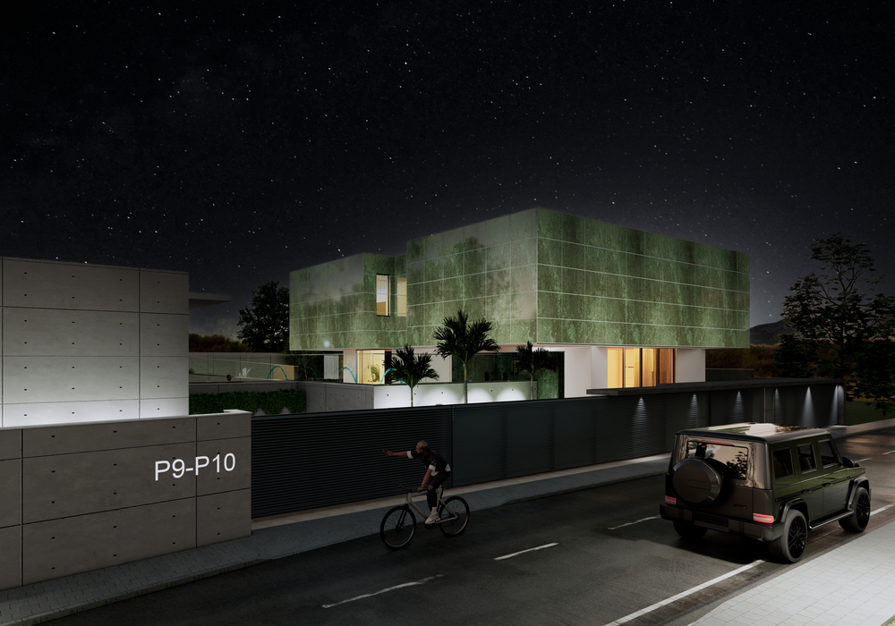 • Fachada contemporânea com materiais naturais e iluminação indireta