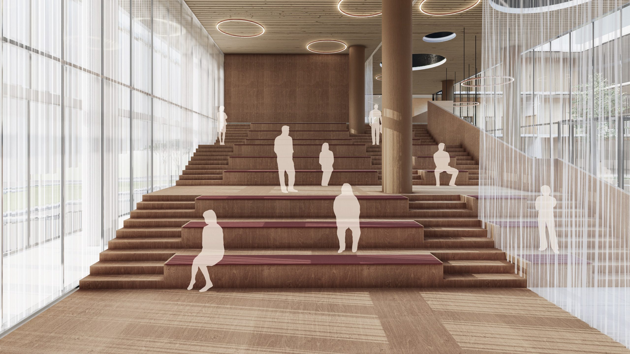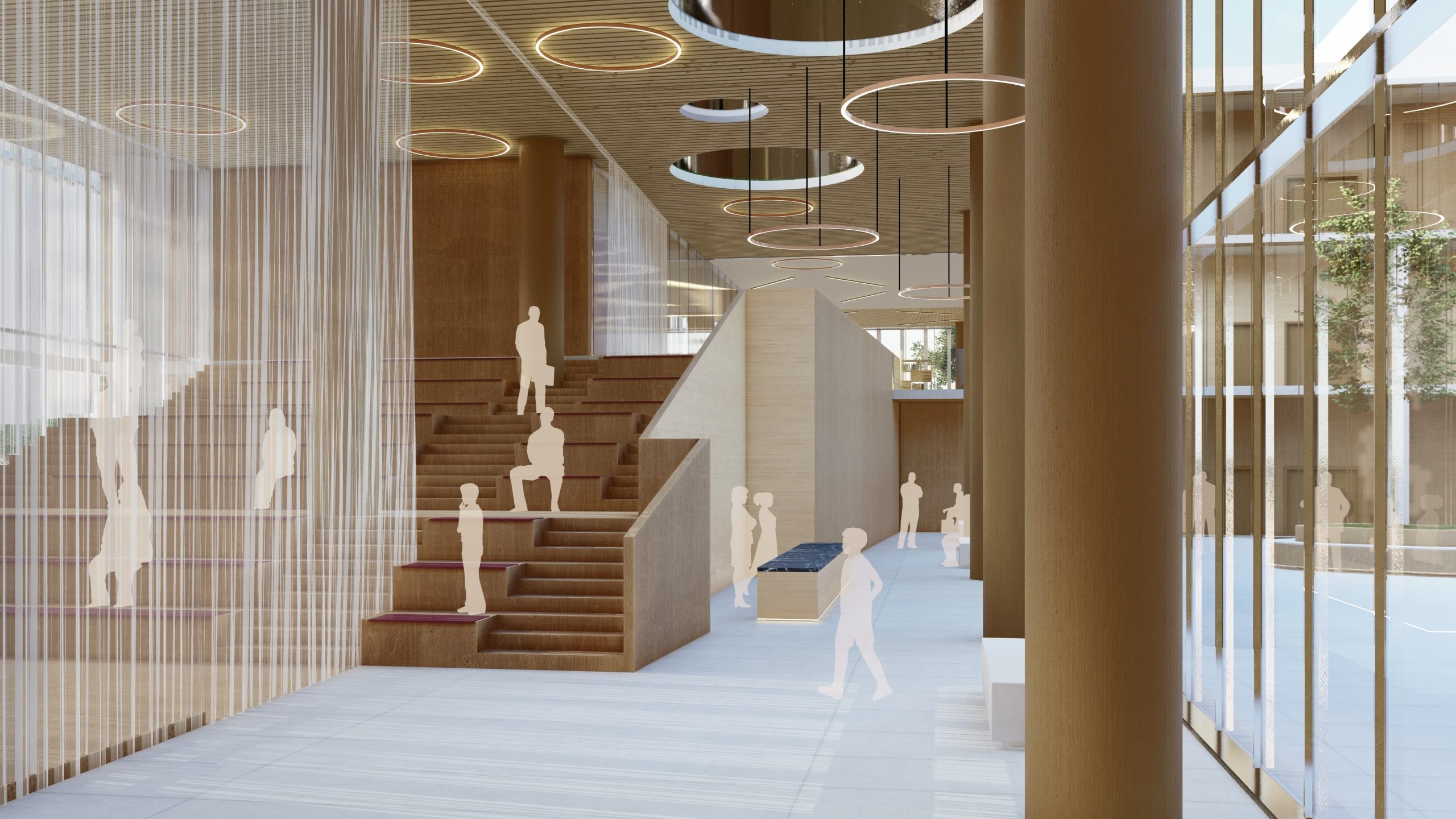 O átrio em duplo pé-direito cria um espaço de acolhimento marcante, iluminado naturalmente