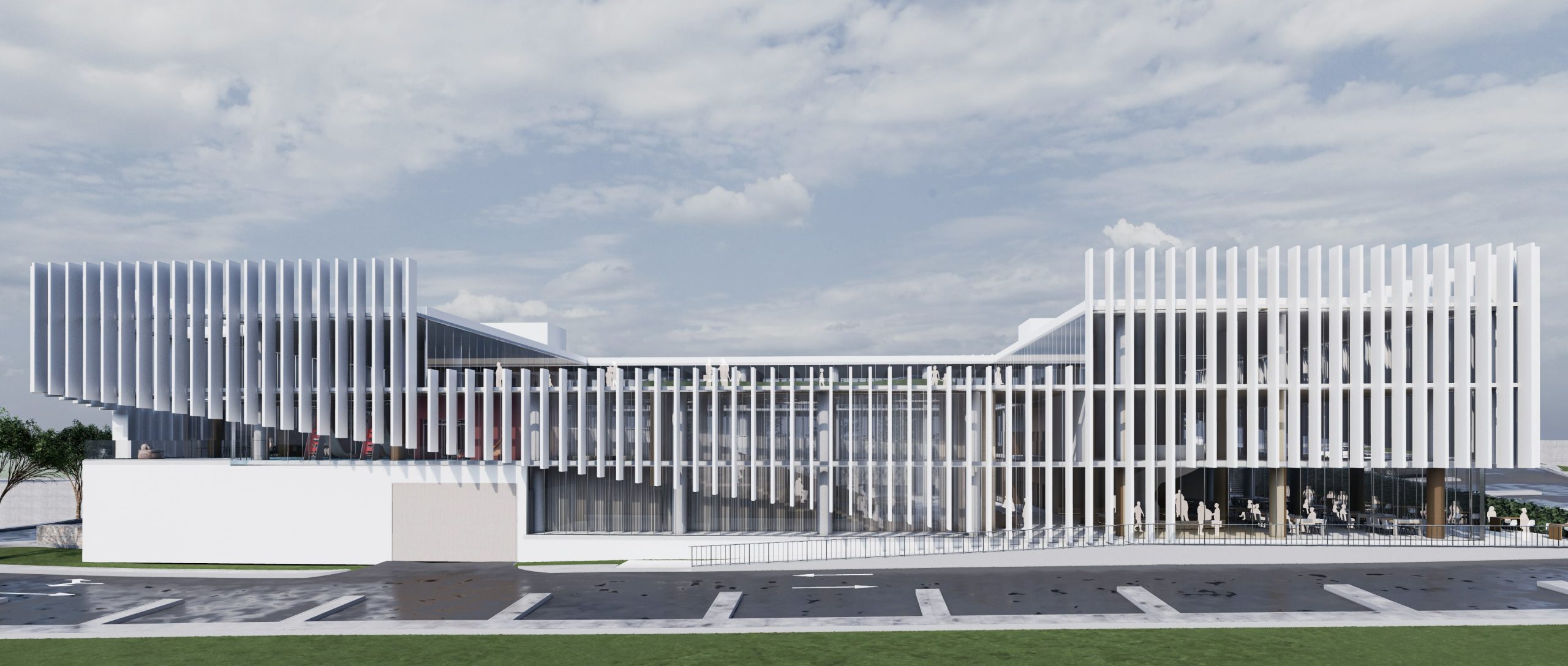 O edifício foi concebido para projetar solidez, confiança e modernidade valores essenciais ao setor bancário. A fachada frontal com elementos verticais metálicos alterna opacidade e transparência, garantindo proteção solar e valorizando a estética corporativa.